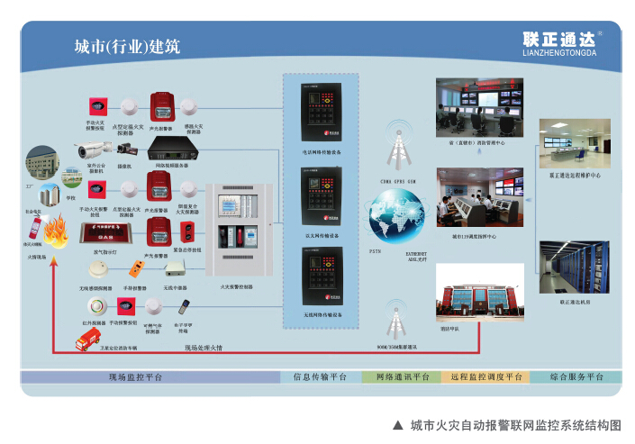 通过设在联网用户端的信息传输设备,从火灾自动报警设备上采集故障和火警信息,并通过无线/有线公共网络传输到监控中心,监控中心将收到的信息实时分析处理,进入相应的处理流程(故障和火警),并将结果通报相关人员。