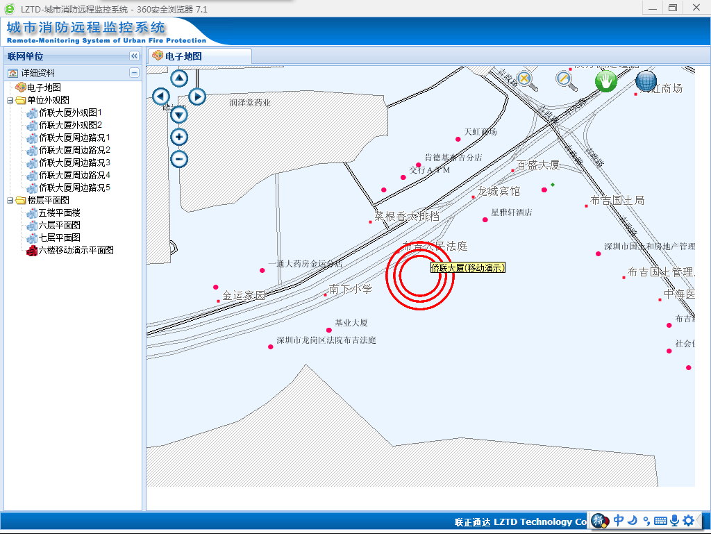 采用GIS技术(消防GIS),当选择任何一个联网单位时,地图系统自动显示该单位在地图上的具体位置。当设备报告火警发生时,地图会自动居中显示联网单位,并报以声光警示。