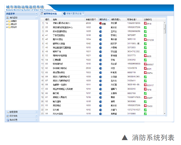 为消防管理部门和联网用户提供信息查询接口,供其登录查询相关统计信息,为消防管理部门对社会单位的监督检查提供依据,为联网用户及时了解自身消防设施的运行状况以及维护提供帮助。